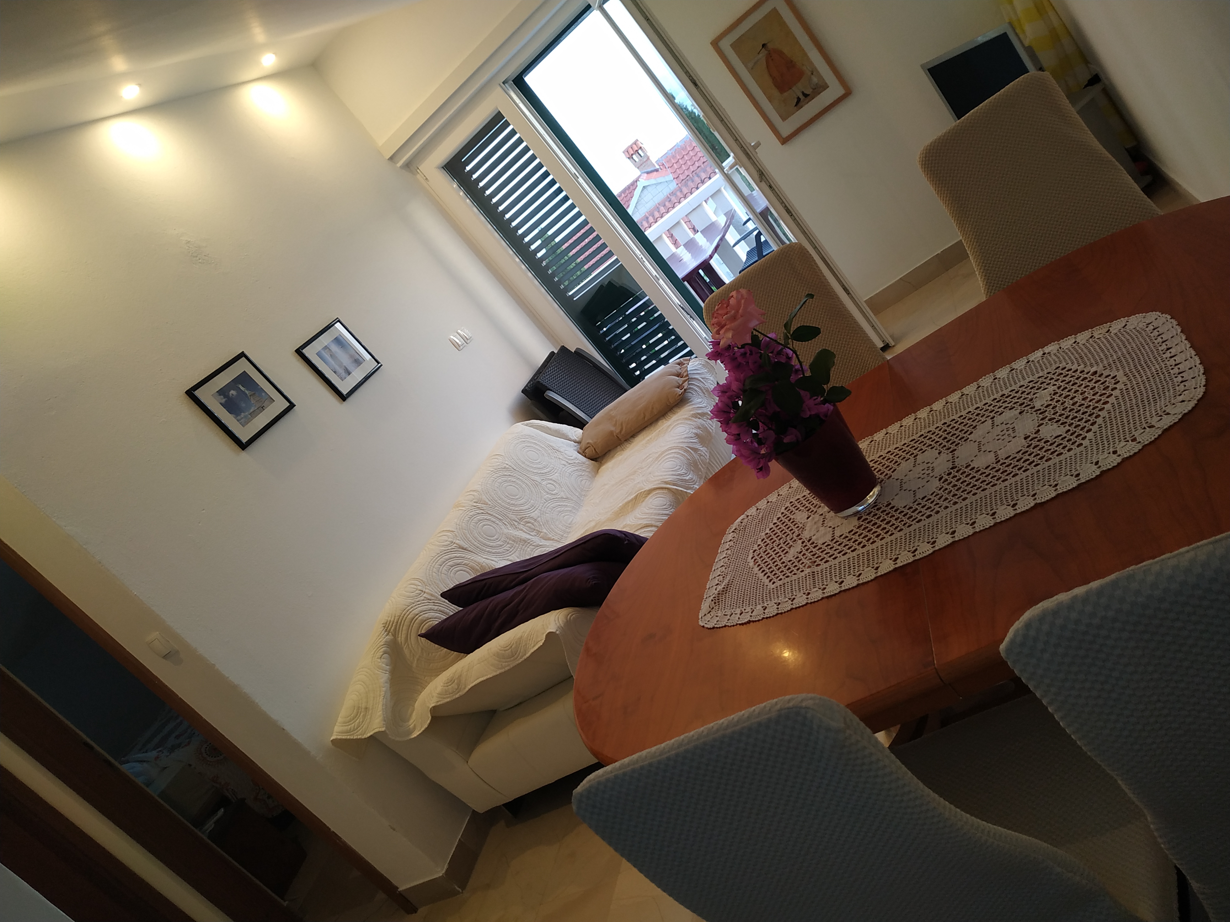 Das Appartement hat ca 75qm und besteht aus zwei Schlafzimmern, einmal mit Doppelbett und einmal mit zwei getrennten Betten (die nach Bedarf verschoben werden können), einem großen Wohnzimmer mit Küche und Essbereich, und einer großen Terasse.